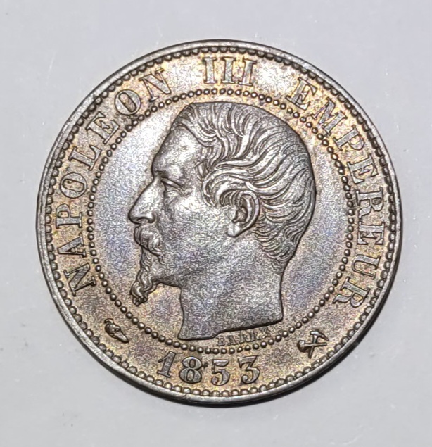 Avers Titulature avers : (LEVRETTE) NAPOLEON III EMPEREUR (MM)//1854. Description avers : Tête nue de Napoléon III à gauche ; signé BARRE au-dessous.