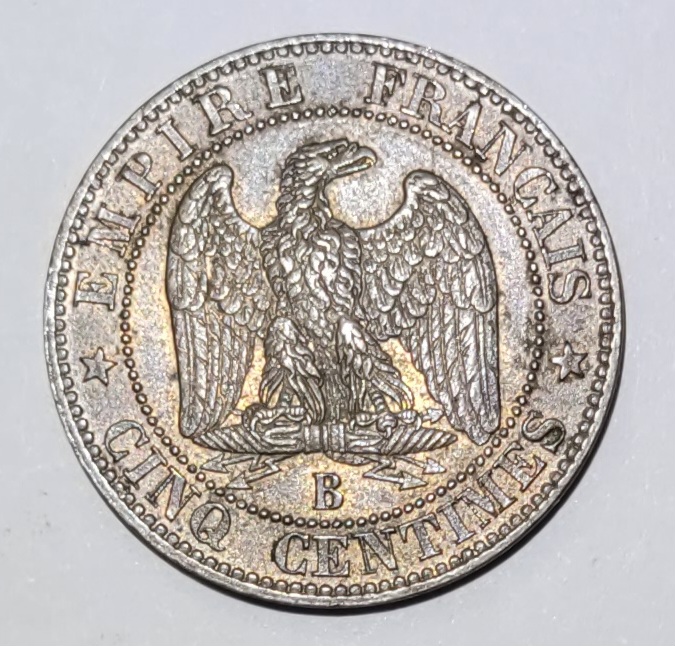 Revers Titulature revers : EMPIRE FRANÇAIS// * CINQ CENTIMES *. Description revers : Aigle debout de face sur un foudre, les ailes ouvertes, la tête tournée à droite ; au-dessous, A.